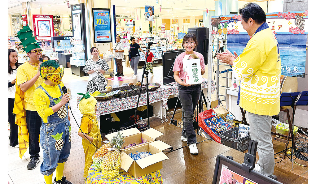 石垣市の特産品や文化を発信する「石垣島フェア」のセレモニーが18日、北中城村にあるイオンモール沖縄ライカム店内の特設会場で行われ、旬の農水産物や伝統芸能を通じて来場者に島の魅力をアピールした。会場には石垣島の約30事業者が出店し、本島では流通していない商品も並び、多くの買い物客や観光客でにぎわった。ライカム店でのフェアは初開催で、21日まで開催される。 物産コーナーには、旬のピーチパインやボゴール…