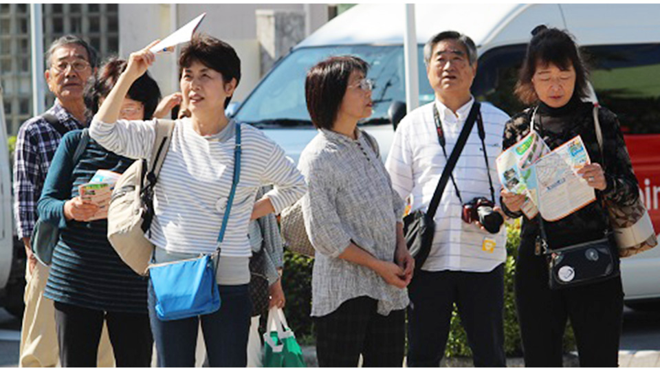大会をPRした琉球コラソンの水野代表(右から2人目)と石田パブリックマネージャー(右端)=16日、石垣市役所