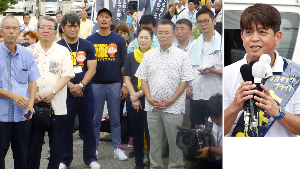 元竹富町教育長の慶田盛安三氏(右)と前川氏=13日夜、石垣市民会館大ホール