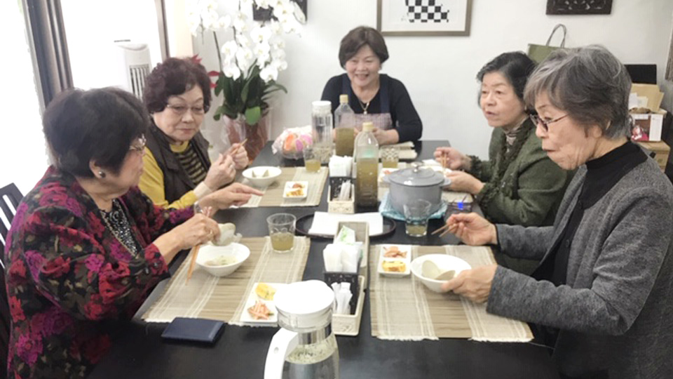 石垣市石垣の崎枝孫芳さん(71)宅では、弟の剛さん(69)、純夫さん(65)、剛さんの息子で人気バンド「きいやま商店」メンバーの大樹さん(44)、孫芳さんの息子で同メンバーの将人さん(43)の家族ら12人が集まった。仏壇に雑炊(ジューシー)を供え、午後7時ごろ、そろって手を合わせた。