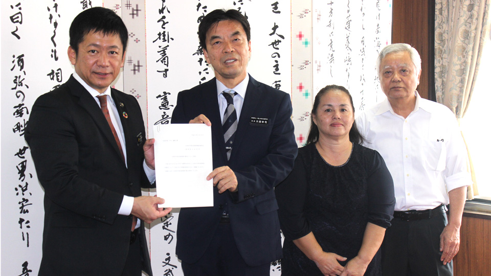包括連携協定を締結した川満副市長(左から2人目)と天羽専務取締役(中央)=9日午後、市役所