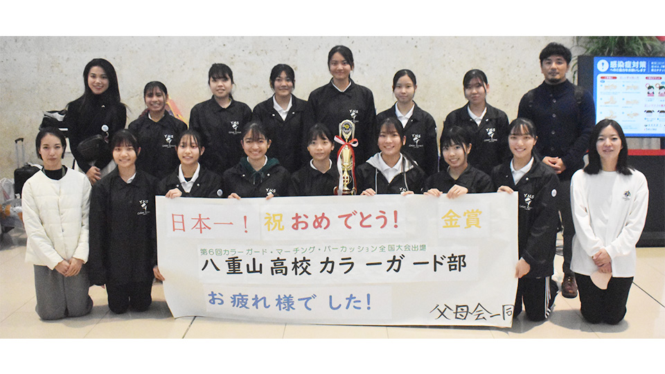 八重高カラーガード部(与那嶺華月部長、20人)は「トゥ ビー ワン」をテーマに、一つの目標に向かって部員が頑張る姿をアピールした。与那嶺部長は「県大会は通過点で、目標は日本一。モチベーションも上がっている。全国大会では誰が見ても感動を与えられるショーをしたい」と決意を語った。