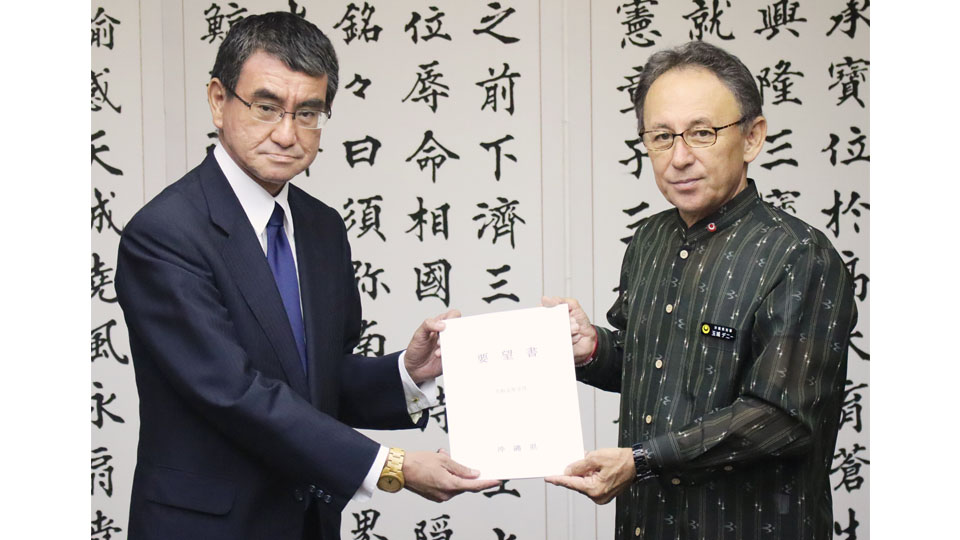 変異株の検査結果などを発表する県八重山事務所の曽根所長(左)と八重山保健所の担当者=28日午後、八重山合同庁舎