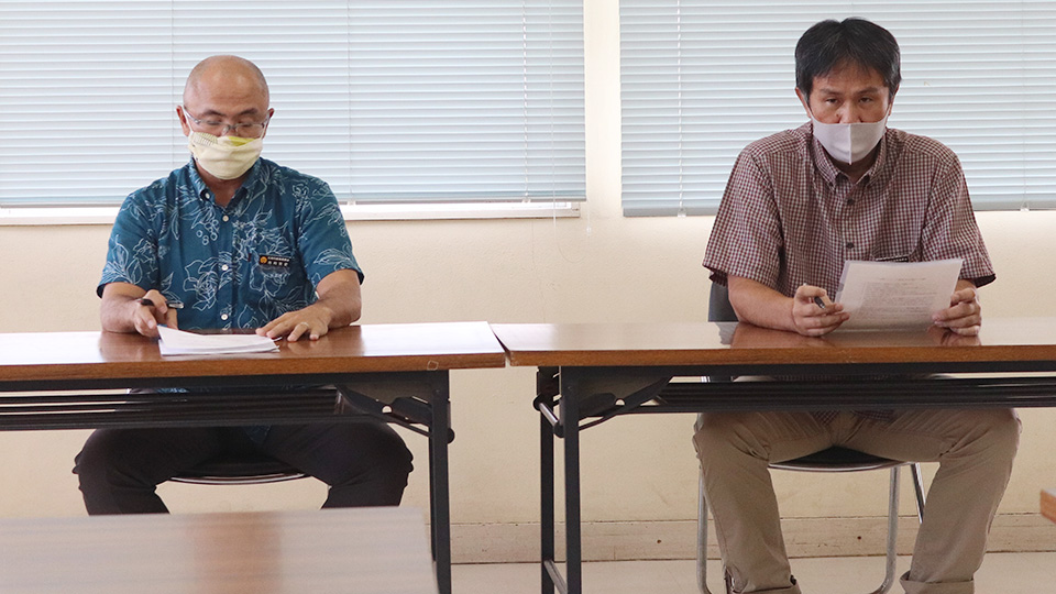 「つぃんだら節の宵」出演者と講評する審査員の岡山稔さん=15日夜、野底小