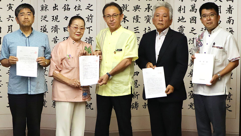 玉城氏はうるま市出身。タレント活動を経て沖縄市議となり、2009年から18年まで衆院議員を務めた。翁長雄志前知事の死去に伴う18年の知事選で初当選した。