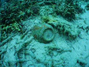 水中での撮影は防水ケースに入れた普通のカメラを使う。陸上と環境が異なるため、水中撮影に関しての知識や技術が必要となってくるのだ。なお、回収した遺物には、サンゴや貝などが大量に付着しており、そのままでは形や色、文様などが読み取れない。剥がすことが難しく、遺物を傷つける可能性もあるため、薬品と道具を併用しながら少しずつ落としていく。なお、その際に使うのが水で薄めた塩酸である。竹富島沖の海底で発見された沖縄産陶磁器。付着物が多く分かりにくいが、灰色の釉が施されている。沖縄本島で生産された陶器類を積んだ船が八重山諸島で海難事故に遭遇したと考えられる(写真2)。