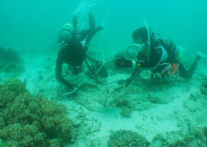 潜水調査では、遺物が確認出来た場所に目印をつけ、散布している範囲を調べる(写真1)。海底に半分以上埋没している場合もあり、砂を払って遺物の確認を行ったり、2人がかりで連携を取りながら、GPSで位置記録を取ったりする。潜る時間が長くなるのも、むべなるかなだ。