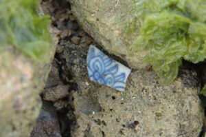1984年に北谷町教育委員会が地元ダイバーの協力を得ながら調査をしたところ、銅板や銅釘、中国産青花(写真2)、ガラス瓶などが見つかり、回収した。行政が主体として行った沖縄県内初の海底遺跡調査にふさわしい成果となった。遺物は同町教育委員会に所蔵されており、一部は文化財展示室で見学が可能だ。