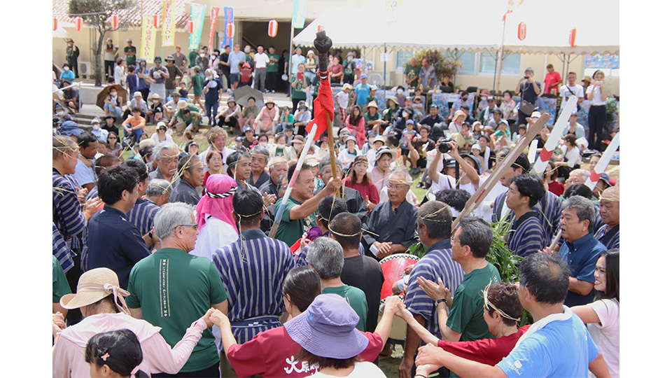 正午過ぎ、久部良多目的集会施設に地元住民や観光客が集まり、久部良小中学校の児童生徒が「日本最西端のビーチ、ナーマ浜より2023年の海びらきを宣言します」と声を張り上げた。