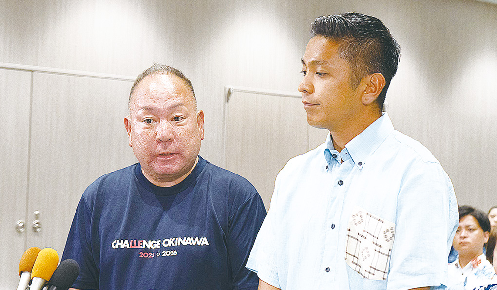 取材に応じた中山市長(写真中央)、山田教授=26日、石垣港