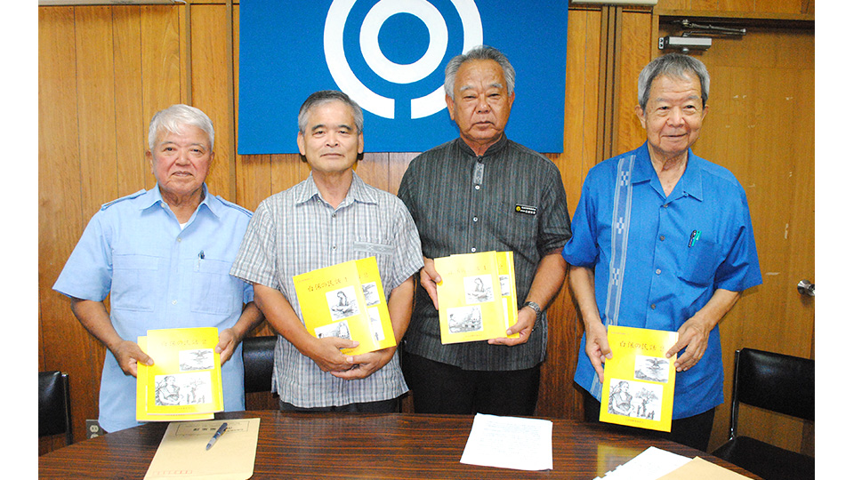 上田代表、同事務所チーフで石垣島平得出身の呉屋小百合さん、協賛したサンバース社マネージャーの吉田譲さんらが市教育委員会を訪問。中山義隆市長、崎山晃教育長が出席し、贈呈式が開かれた。