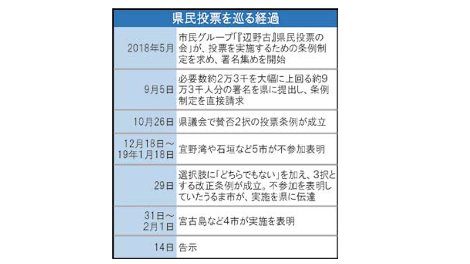 米軍による伊野田漁港の施設利用は、市民が先月24日に市に申請。漁業者と共に救難訓練を行うとして、港湾内にプレハブ小屋1棟を設置し、漁船1艇、ゴムボート3隻を係留した。今月7日から月末まで使用するという内容。今月3日付で水産課の新城保一課長が決裁し、市長職務代理者の知念永一郎副市長に報告した。