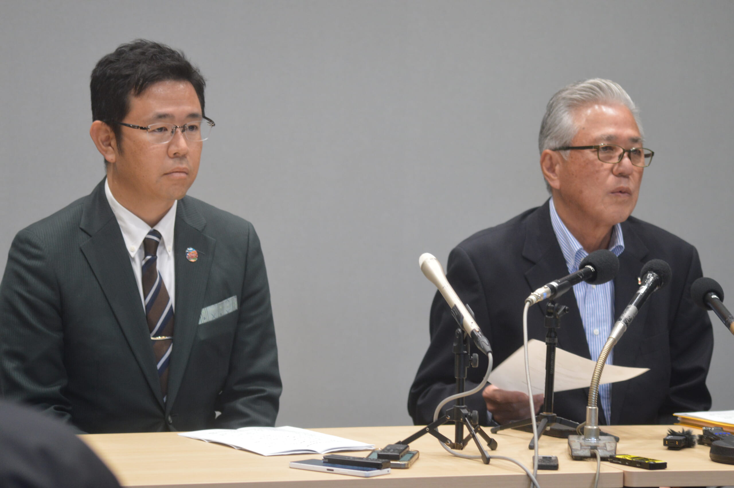 選考委員会の会合後、記者会見する古謝氏(左)と金城委員長=11日、那覇市