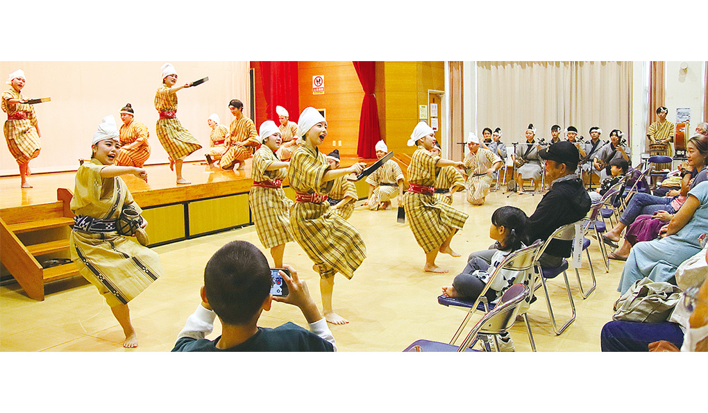 八重農・八商工の郷土芸能部が新作「世ば稔れ(ユバナウレ)」を披露した=11日、健康福祉センター