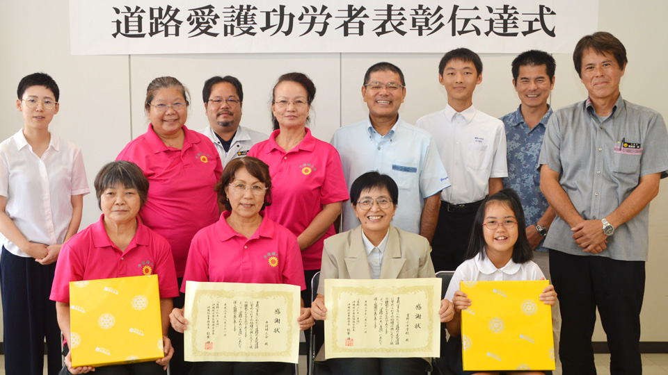 3集落のミルクを先頭に仮装行列を組むミチサネは午前9時15分にスタート。今年は西村(イリムラ)、東村(アリムラ)、前村(ナームラ)の順に登場し、公民館までの道のりをパレードした。公民館到着後には村ごとに棒と太鼓が演じられ、午前の部の最後には全員でニンブチャー(念仏踊り)を踊った。