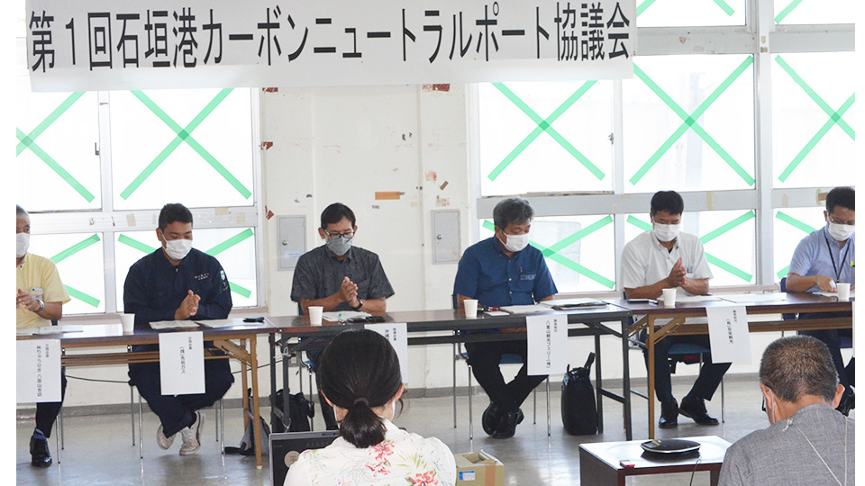 会合であいさつする宮腰氏(中央)=14日、沖縄総合事務局