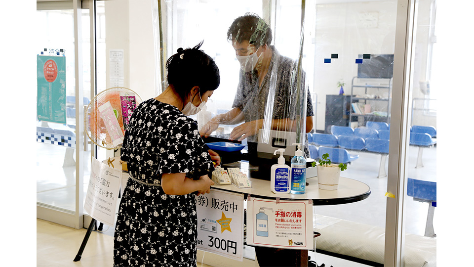 ベーグルサンドを受け取る参加者ら=13日、イシガキラボ