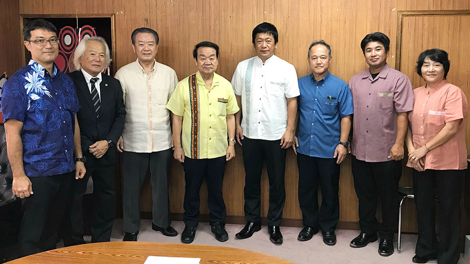 玉城知事に要請書を手渡す浜田村長(中央右)と新垣村長(同左)。中部選出で会派おきなわの新垣光栄県議(左端)が同席した=21日、県庁