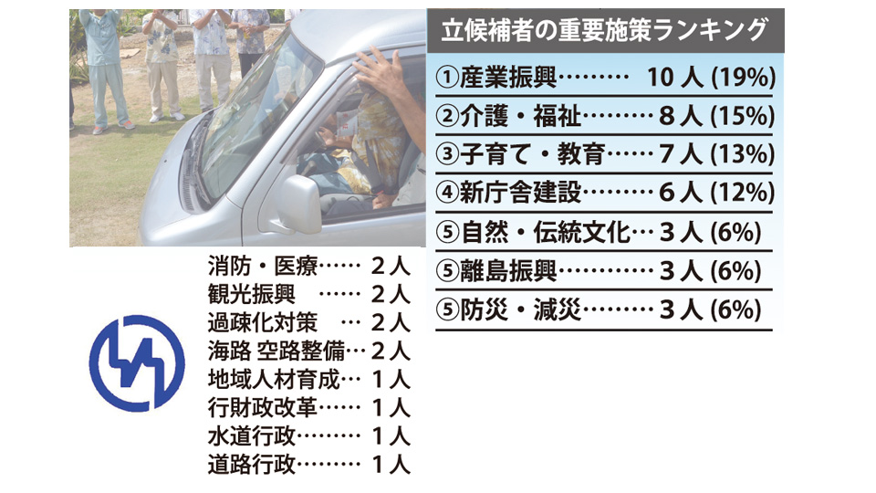 特集 候補者の重要施策は? 産業振興1位・新庁舎建設4位 竹富町議選 竹富町議選(定数12)が4日告示され、各島や地域で選挙戦に突入した。定数12に対し、立候補者は15人。本紙は5日までに立候補者アンケートをまとめた。候補者が訴える施策をランキング形式で紹介する。1位には第1次産業などを含む「産業振興」が19%、役場移転を含む「新庁舎建設」は4位の12%だった。 アンケートは各候補者が重要施策を3つ回答するもの。アンケート回収後、回答内容を項目別に分類してランキ… 2018/09/06