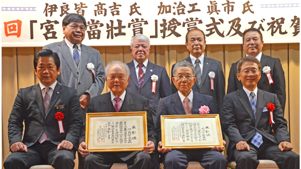 一般 伊良皆、加治工氏を表彰 宮良當壯賞で授賞式 第2回宮良當壯賞の授賞式と祝賀会(八重山日報社主催)が17日、市内ホテルで開かれ、県指定無形文化財八重山民謡技能保持者の伊良皆高吉氏(81)、県立芸術大学名誉教授の加治工眞市氏(80)が表彰された。会場には関係者らが駆け付け、2氏の功績を祝した。 伊良皆氏は「先輩方が私の進むべき道を与えて下さった。それが今の賞につながった」と先駆者に感謝。「先達が残してくれたものに一歩でも近づきたい。それが死… 2019/02/18