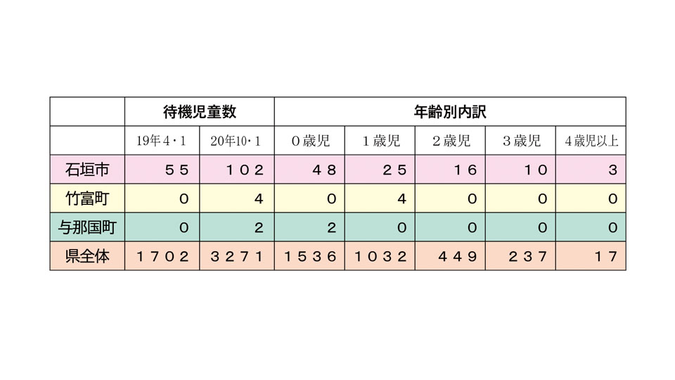 待機児童数は石垣市が102人(同9人増)、前年同月にゼロだった竹富町は4人、与那国町は2人。入所申し込み児童数は石垣市2516人(同41人増)、竹富町142人(同113人増)、与那国町41人(同13人増)。