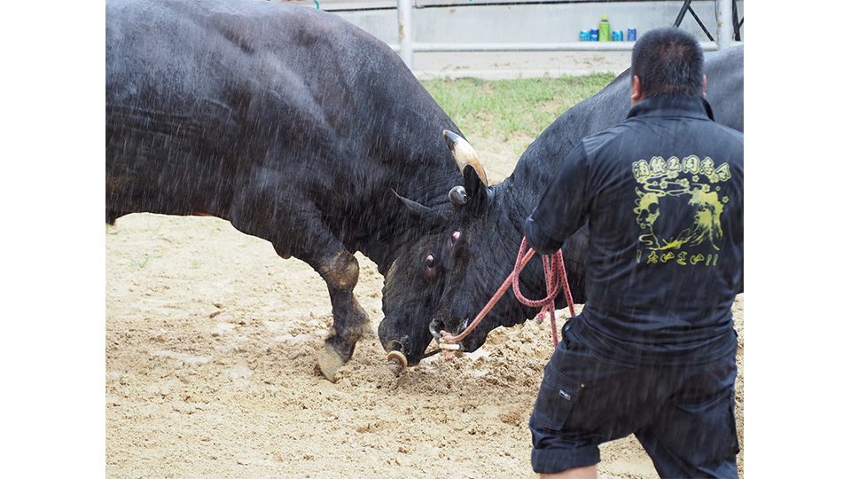 今大会に出場したのは同組合の闘牛計16頭。時間制限ありの若手育成対決から時間無制限のベテラン戦まで全8試合が行われ、激しいぶつかり合いで会場を沸かせた。