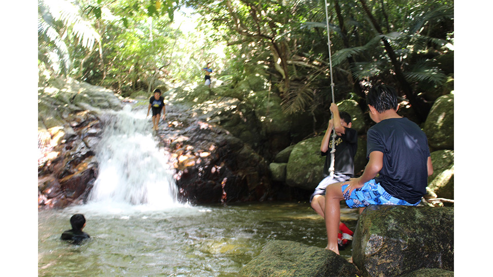 やんちゃな男の子たちには格好の水遊び場だ。滝つぼに飛び込んだり、木から吊るしたロープでターザン遊びを満喫している。
