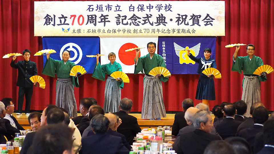 石垣市立白保中学校創立70周年記念式典・祝賀会(主催・同校創70周年記念事業期成会)が8日午後、同校体育館で開かれ、在学生や保護者、卒業生、教育関係者ら約300人が出席した。﨑山晃校長は「本校が社会に送り出した卒業生は2658人を数える。学校、家庭、地域が連携して『切磋琢磨』の精神を合い言葉に、生きる力を育み、郷土愛に燃え、世界に羽ばたく人材育成に教職員一丸となって教育活動を充実させていきたい」と決意を新たにした。